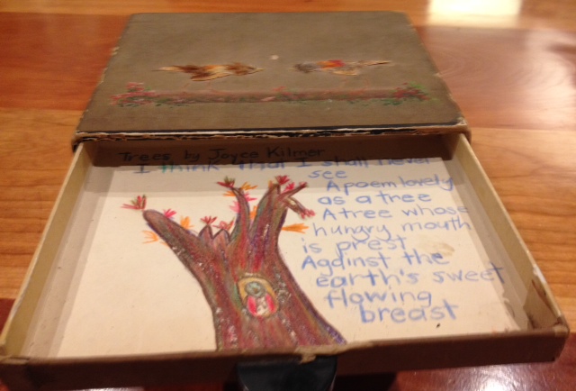 When Sasha and Flo find a 1930s box at the local antique store, they decided to make a box tree art project. Sasha includes Joyce Kilmer’s poem (partial) and her Paw Paw’s poem. Flo adds some color atop of the colored pencils Sasha used to render the tree.