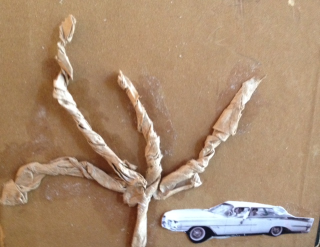 Sasha makes a tree out of a paper bag fragment to add to the tree box.