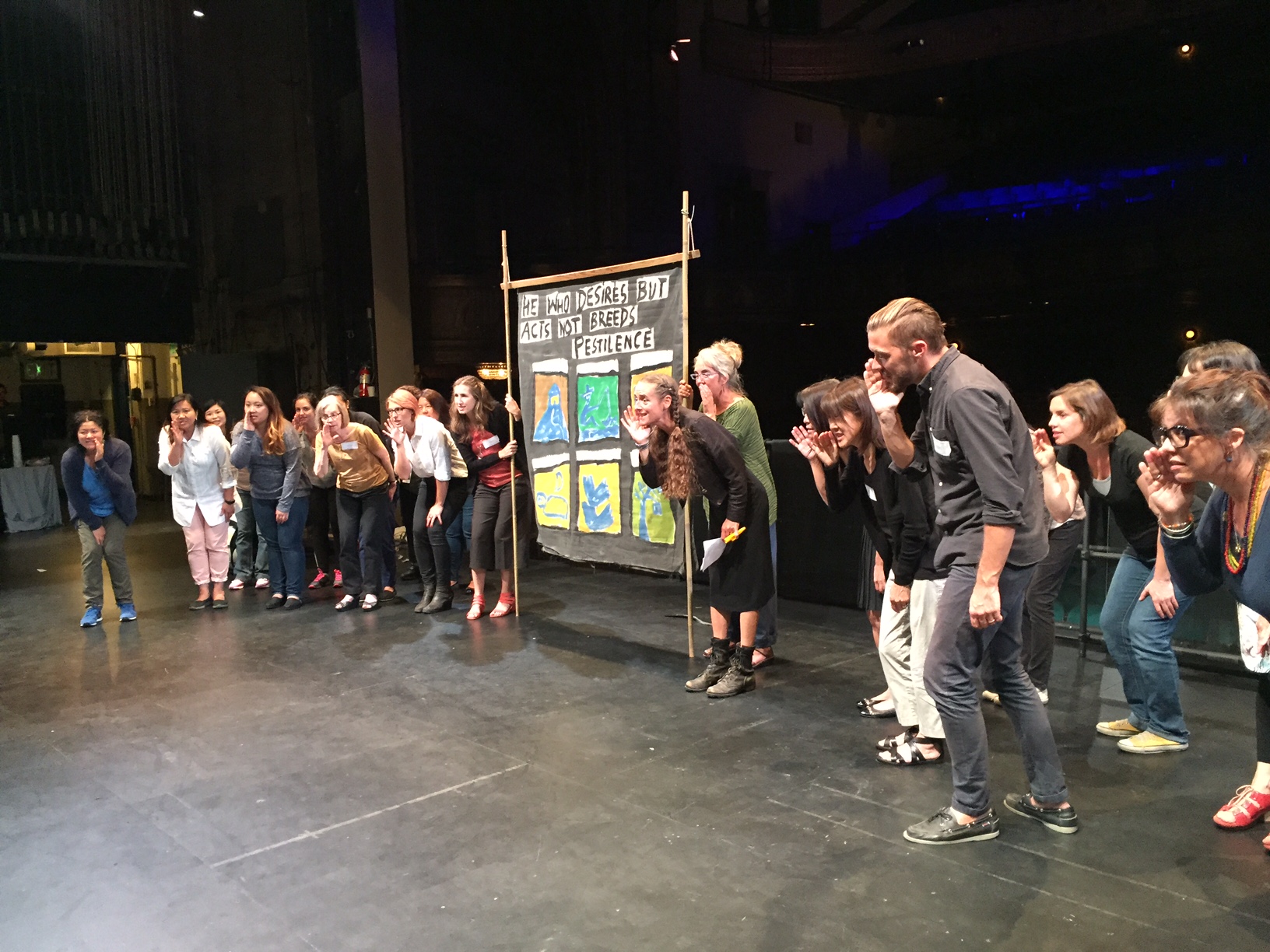 On Thursday, October 8, 2015, from 4pm-6pm, San Francisco Unified School District Visual and Performing Arts Department Elementary/K-8 and Secondary Arts Coordinators gathered on the stage of the Curran Theater for a Cantastoria Workshop, led by Clare Dolan and members of the 2015 West Coast touring company of Bread and Puppet Theater.