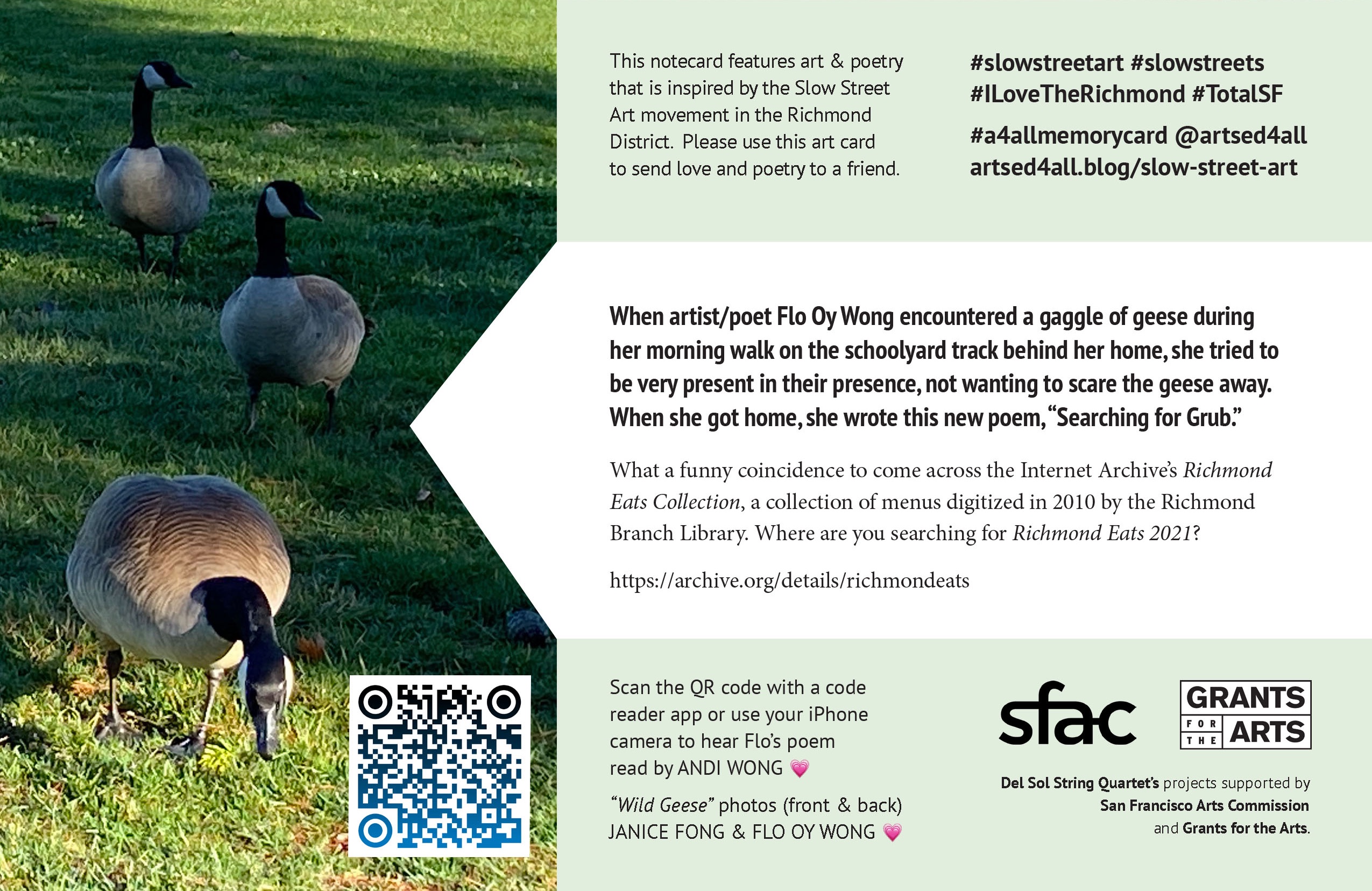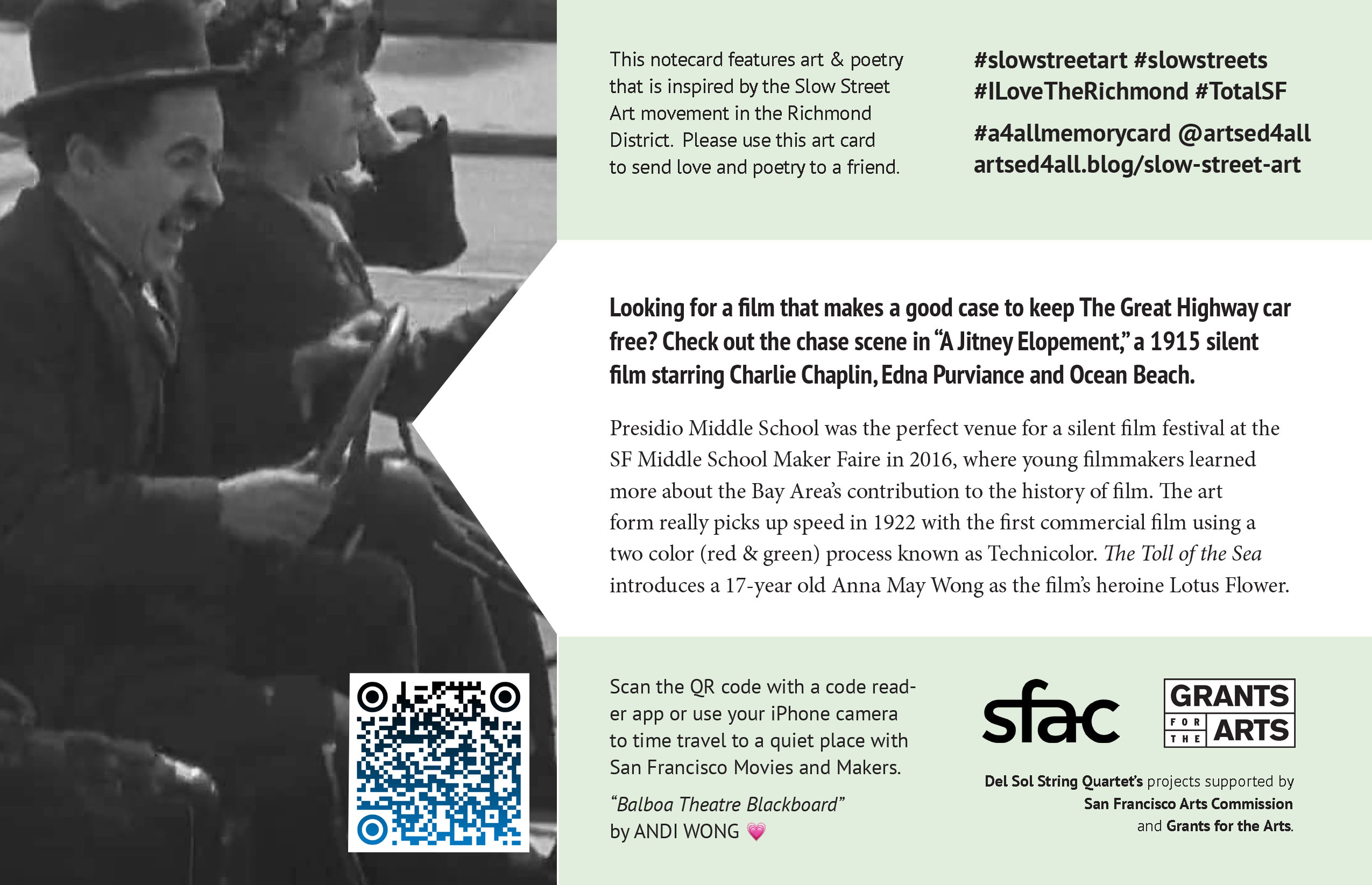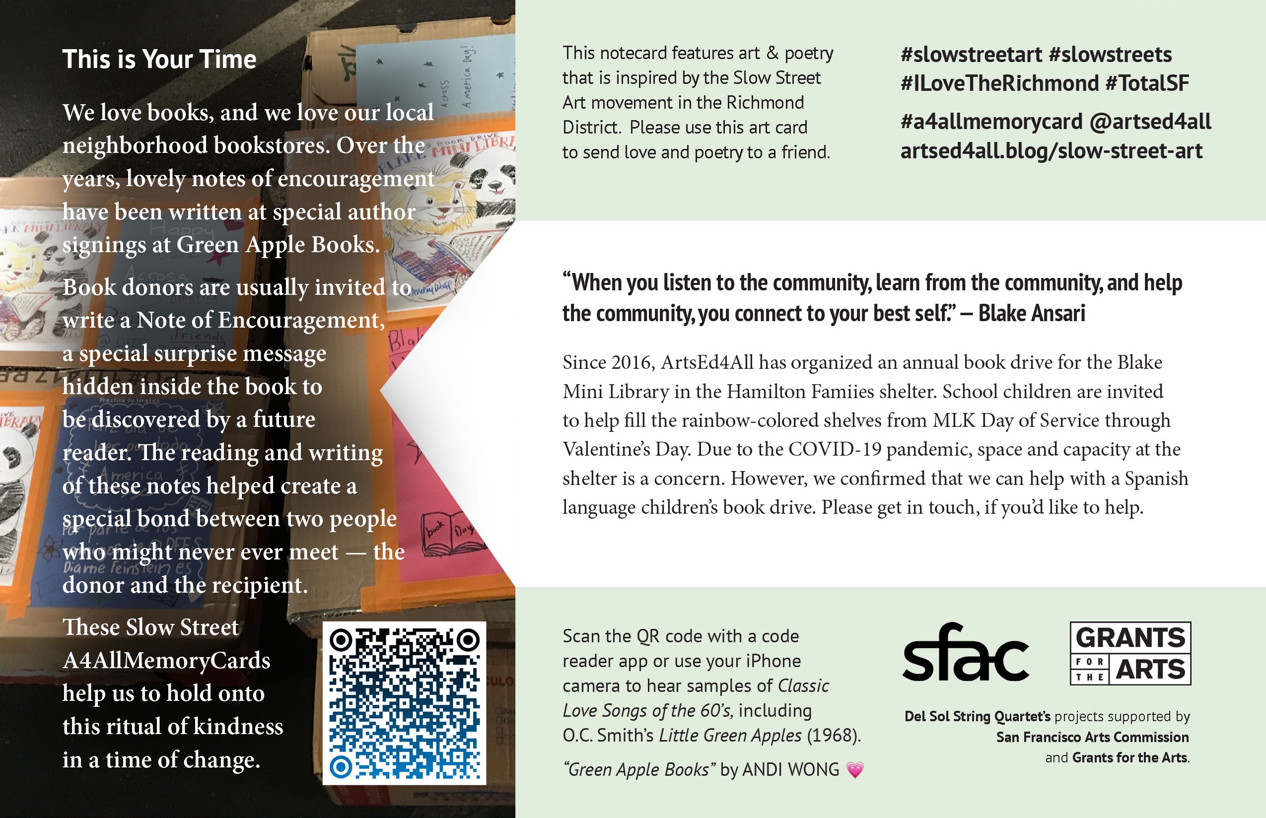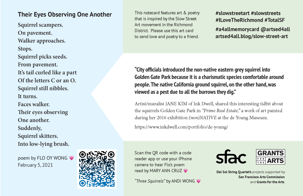 Each ArtsEd4All notecard features art and poetry that is inspired by the Slow Streets Art movement in the Richmond District. The cards share stories and and things that we have learned as we have explored the neighborhood over the years.