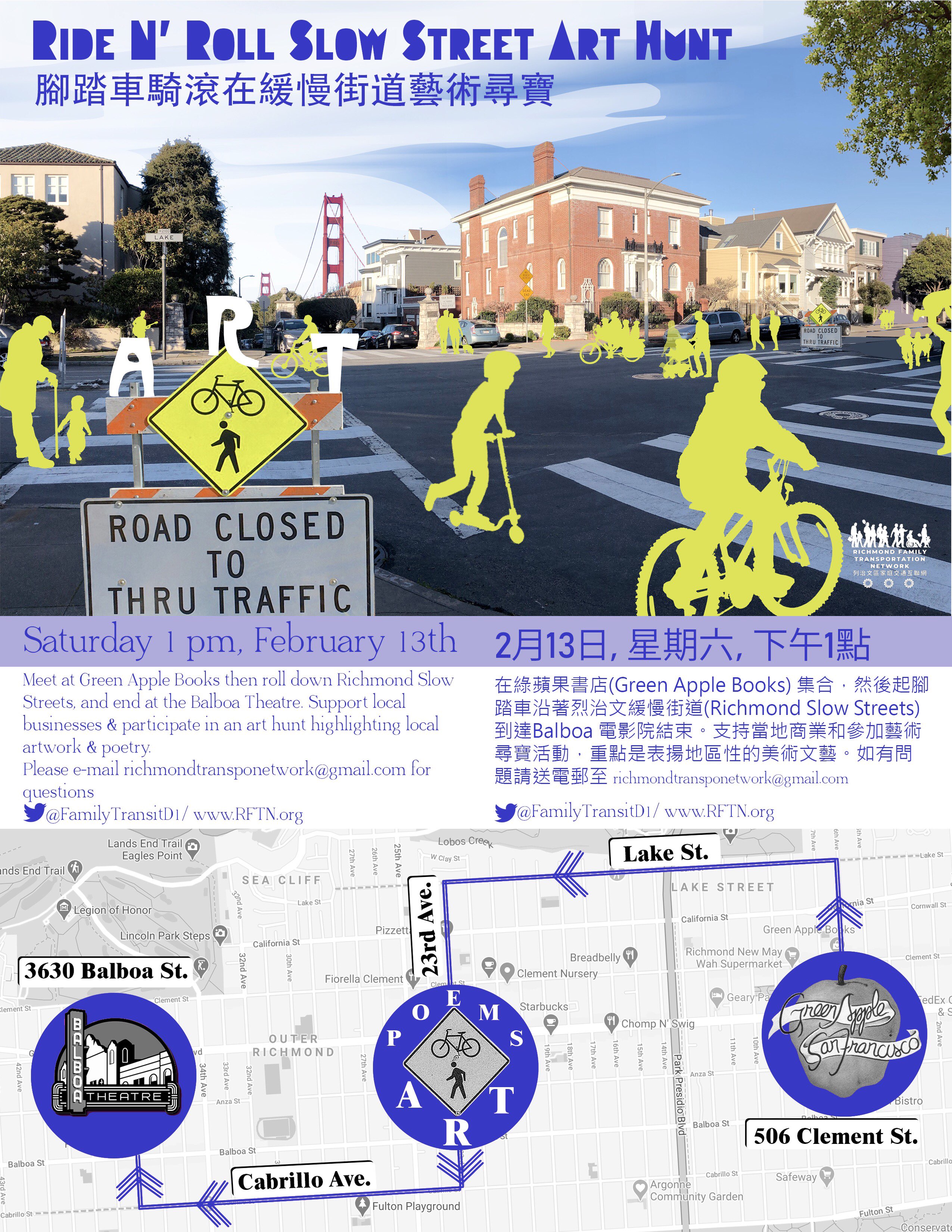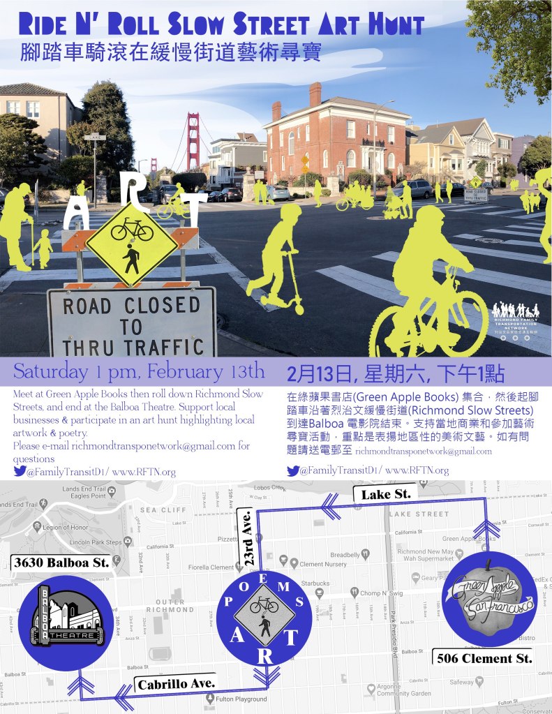 We are looking forward to the Ride N’ Roll Slow Street Art Hunt on Saturday, February 13 in the Richmond District. The event will start at 1 pm at Green Apple Books with poetry by Mark J. Mitchell and end with Norton the It’s It at the Balboa Theater at 3pm. Come out and support local businesses and participate in an art hunt highlighting artwork and poetry. You will have a great time, come rain or shine!