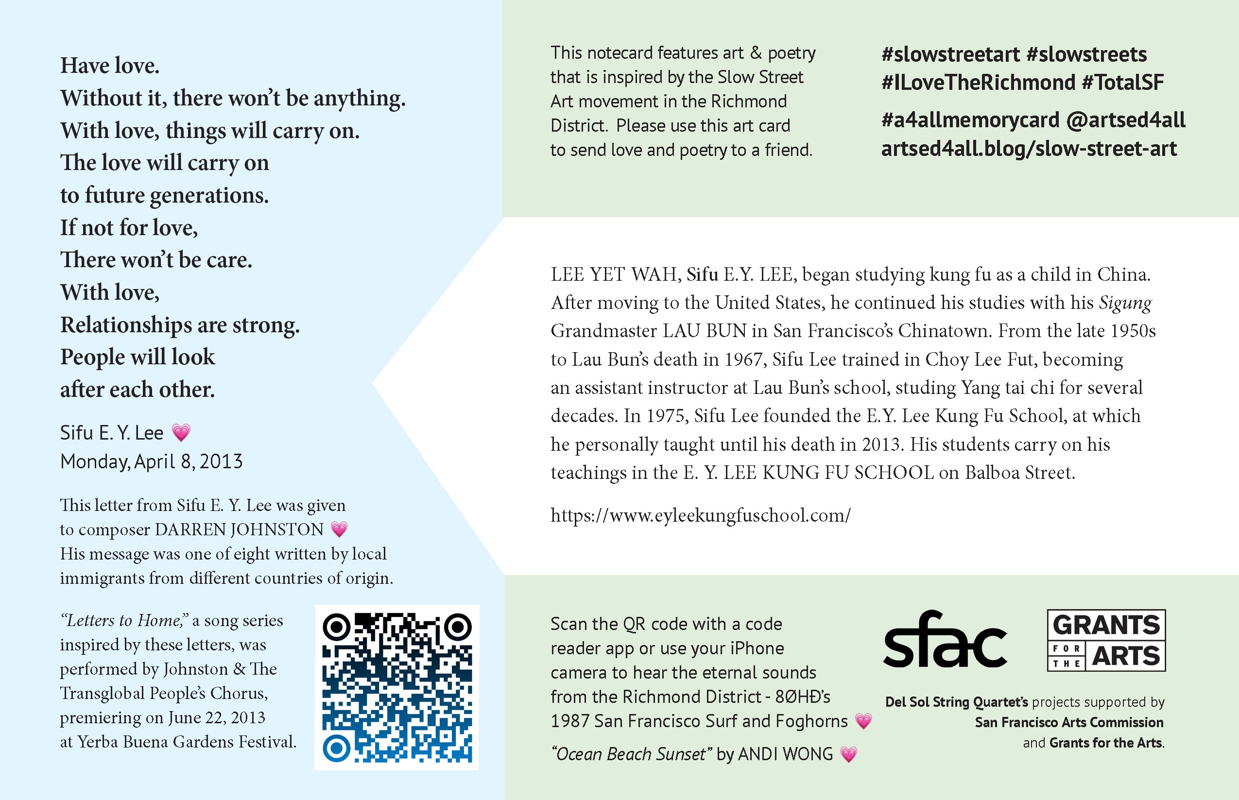 If you find one of our art memory cards inside a pre-stamped envelope on Slow Streets, we hope that you will enjoy the art, poems and our memories of good times in the Richmond District. When you are ready, please use the card to send love and poetry to a friend.