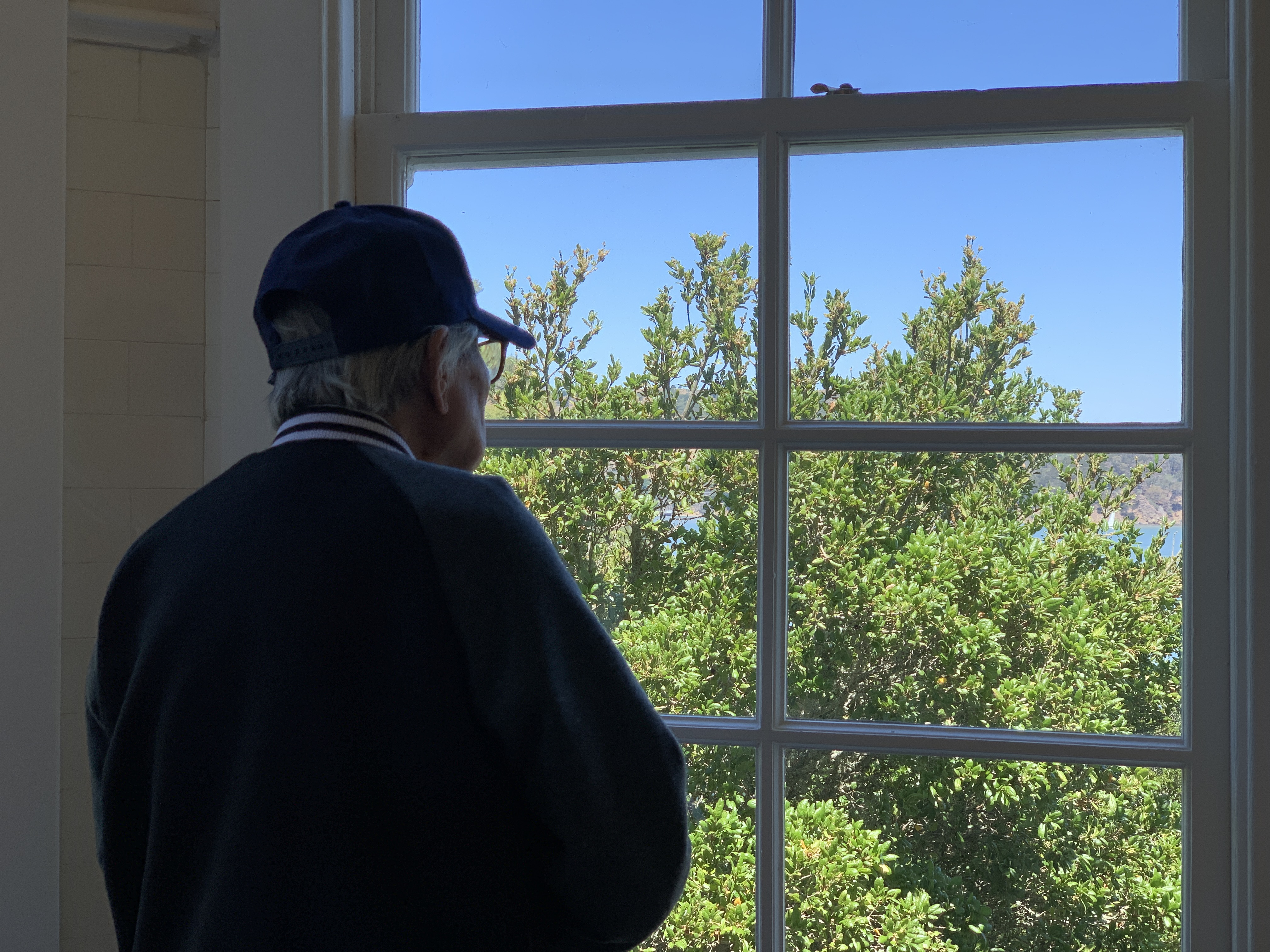 In this photo, Calvin was looking out the window of the former immigration hospital when he noticed the hillside below. He could remember sitting on the hill and watching the ferry arrive with new immigrants each day. Later, we went outside so Calvin could look out over the water with his children and grandchildren.