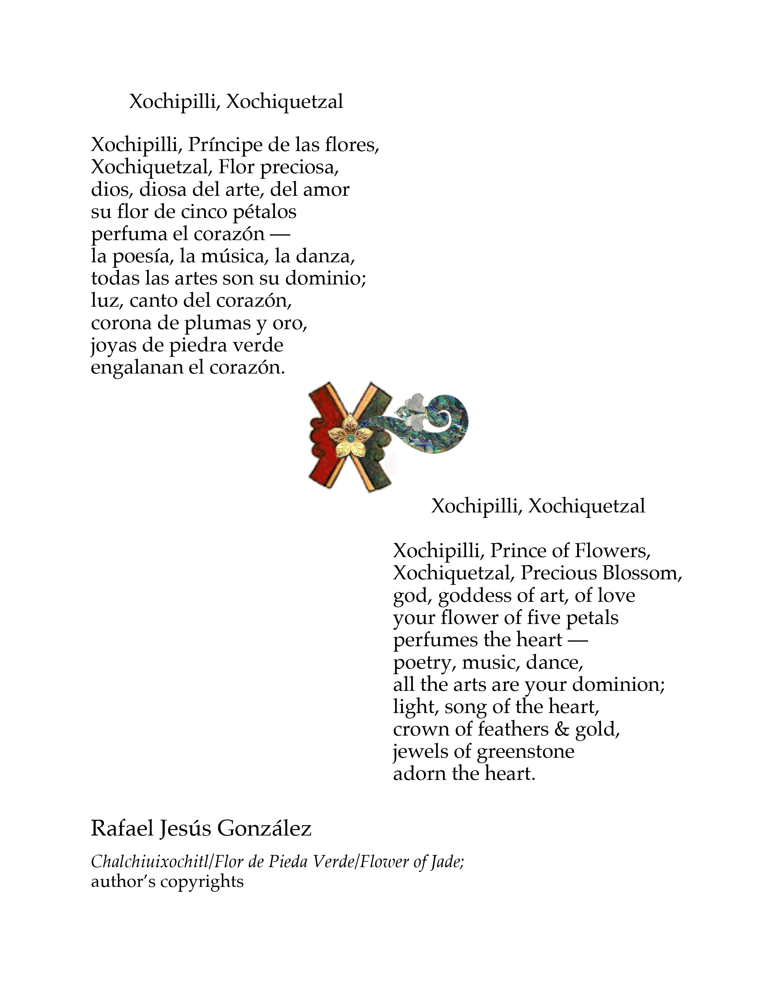 The Nahua cultures of ancient Mexico held that in xochitl in cuicatl, flor y canto, flower & song, poetry, the inspired word was the only thing that endured because it spoke truth. CHALCHIHUIXOCHITL, FLOR DE PIEDRA VERDE, FLOWER OF JADE is an attempt to capture the truths of our time and our world through an approximation of the lens of sensibility and perception of our Nahua forebears.